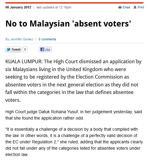 The article would be fairer if it explained why the application was deemed "odd". It is not odd in the sense that one might question why overseas Malaysians want voting rights. It is odd because the applicants sought to seek absentee voter status by applying for judicial review of the EC's decision, when the EC followed the definition of absentee voter in the Elections Act. They should have instead applied for judicial review of the validity of the relevant regulation of the Elections Act. They need a new lawyer.